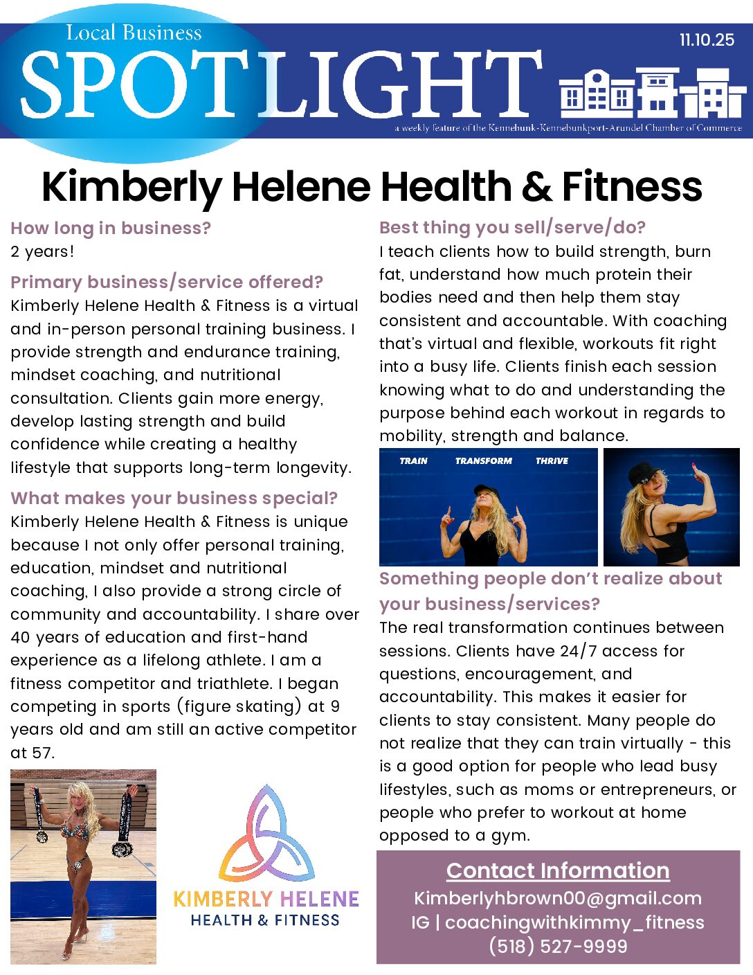 Kimberly Helene Health & Fitness is a virtual and in-person personal training business that provides strength and endurance training, along with mindset coaching and nutritional consultations!