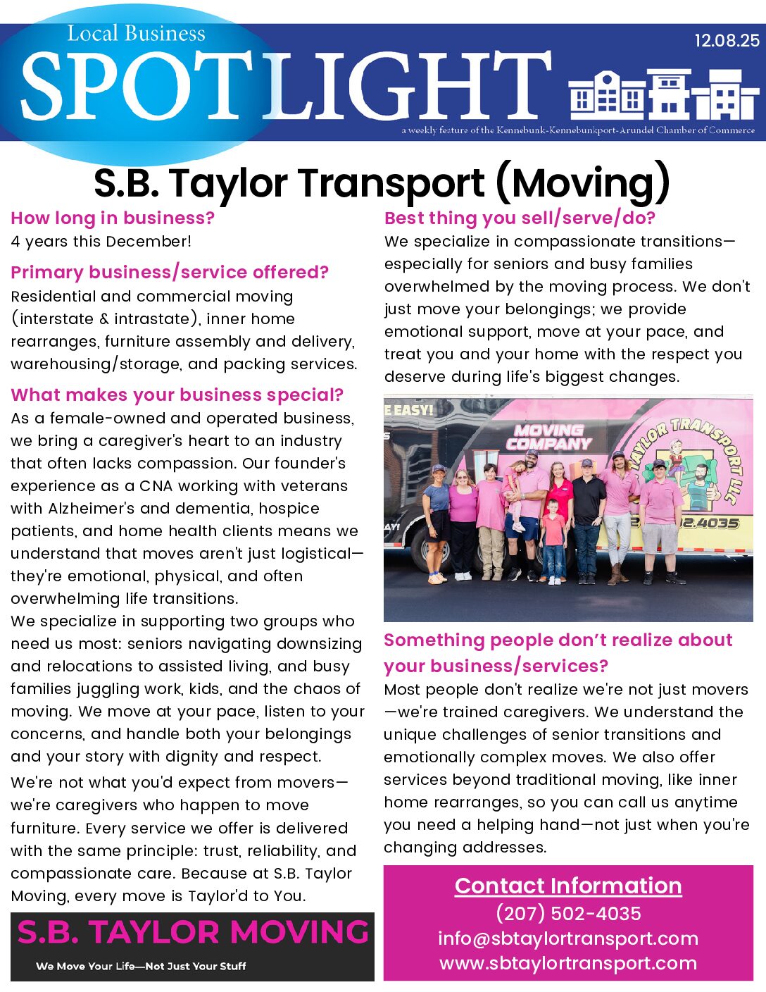S.B. Taylor Moving/Transport is a local company offering services ranging from residential and commercial moving (interstate & intrastate) to inner home rearranges and furniture assembly, packing services and more.