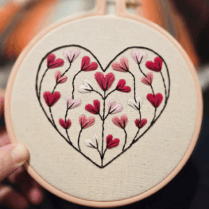 Enjoy a relaxing evening of embroidery in this beginner-friendly class. Create a charming heart design using simple stitches and guided instruction. All materials are provided. Bring your favorite drink, unwind, and enjoy a cozy night of creativity.